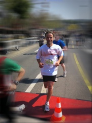 Bis über km 38 lief alles rund. Kurz nachdem ich mit boumi (Das Foto oben stammt von ihm und er absolut unschuldig für meinen Absacker) das wohl kürzeste Tweetup der Geschicht abhielt ;-) kam die berüchtigte Wand, steinhart! Die Waden hatten plötzlich keine Energie mehr, ich keine Motivation, keine Lust mehr weiterzulaufen… also machte es auch hier wie im Training ich ging einfach einige Schritte, vermutlich war es eine halbe Minute bis sich der Körper wieder in den Laufrhythmus schwang und ich fast federleicht dem Ziel entgegenschwebte. Die Tempomacher hatten glücklicherweise eine Minute Reserve eingerechnet, so dass ich wirklich unter 4 Stunden im Ziel einlief, was ich mir eigentlich nicht hatte vorstellen können.
