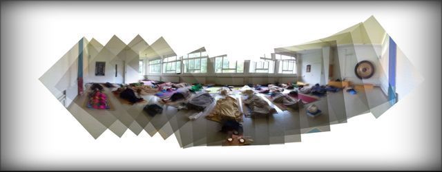 Die Abschlussklasse MYU 13 und einige weidere YogalererInnen, 35 an der Zahl, warteten um 06.00 auf mich. Alle in ihrer Sitzposition auf die Meditation wartend überraschte ich sie mit einem Yoga Nidra (Schlaf der Yogis / Tiefenentspannung): allgemeine Erleichterung.